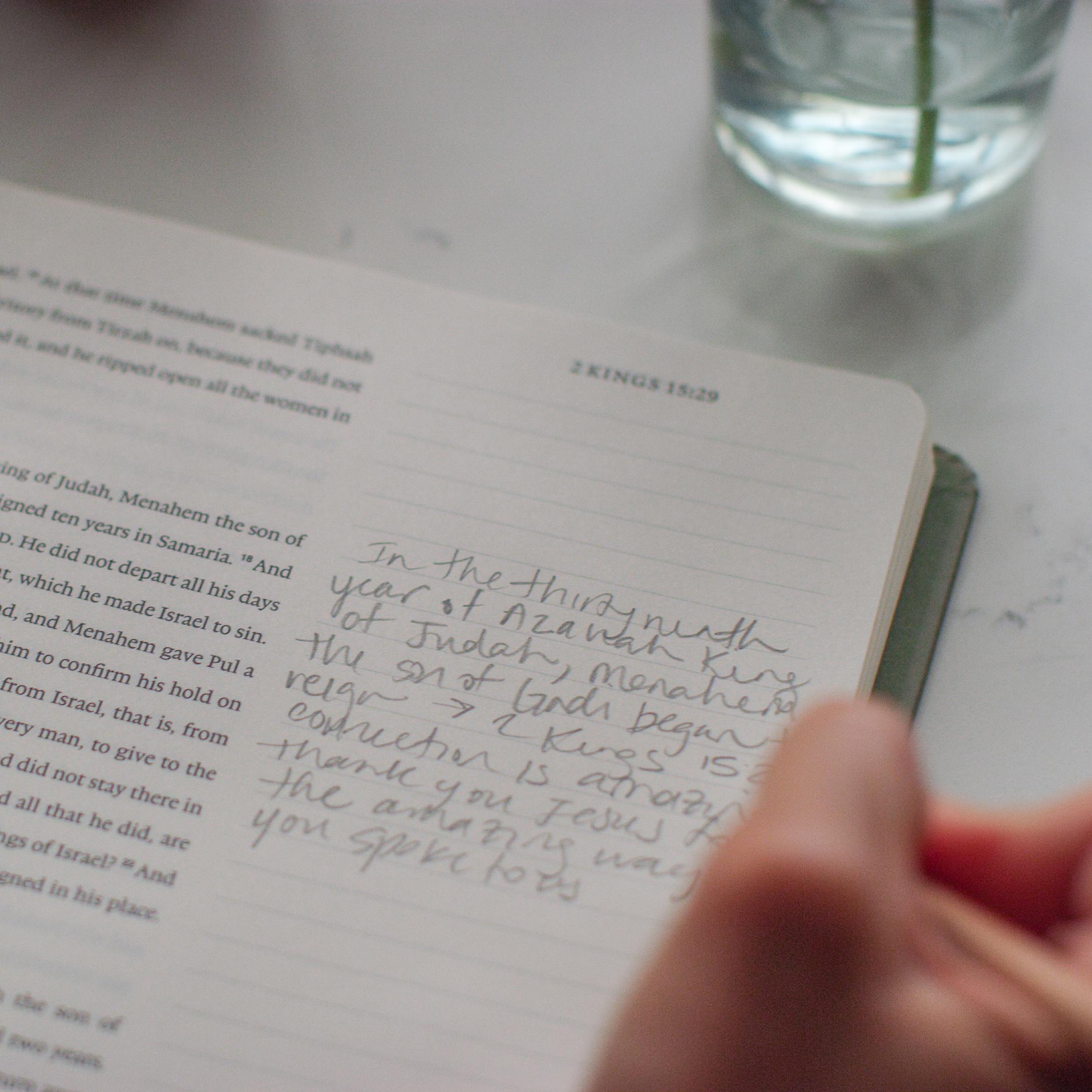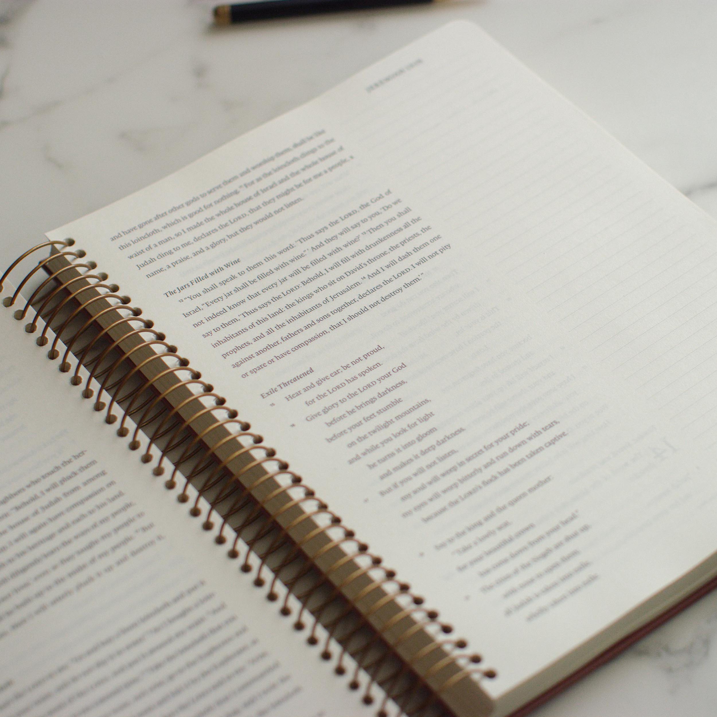 “Whether you are studying to teach or meditating on the Scriptures, this journaling Bible is what you’re looking for—a sturdy, spiral-bound Scripture option that will stay open! Some mornings I’m jotting down Hebrew or Greek, translation notes, and teaching outlines. Other days the notes column is filled with prayers in response to God’s Word. Whatever you’re doing, this journaling Bible will help you take in what God has said and record what you discover.”